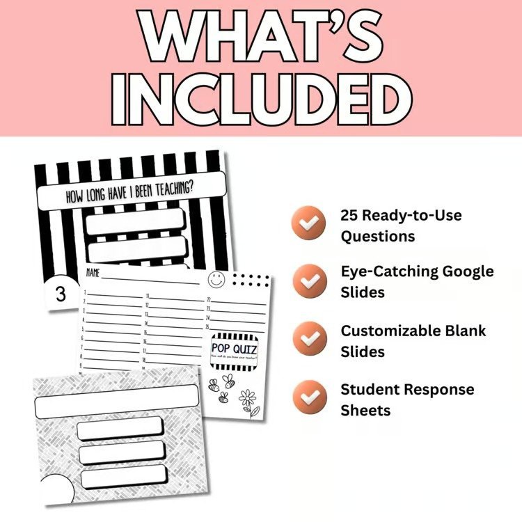 • Eye-Catching Google Slides: A visually appealing, black and white presentation to display the quiz questions. Get ready for instant engagement!