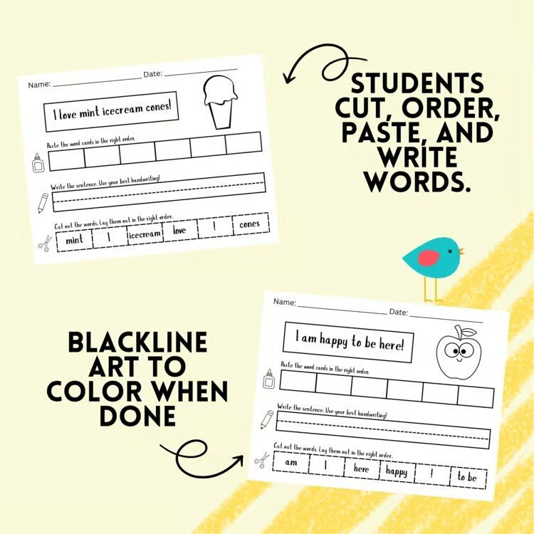 Engage your students with this no-prep, cut and paste sentence builder activity! Perfect for the beginning of the year, this resource offers student choice and helps build foundational literacy skills. Students will read, cut, sort, paste, and write to create their own sentences. Make learning fun and interactive with this easy-to-use resource!