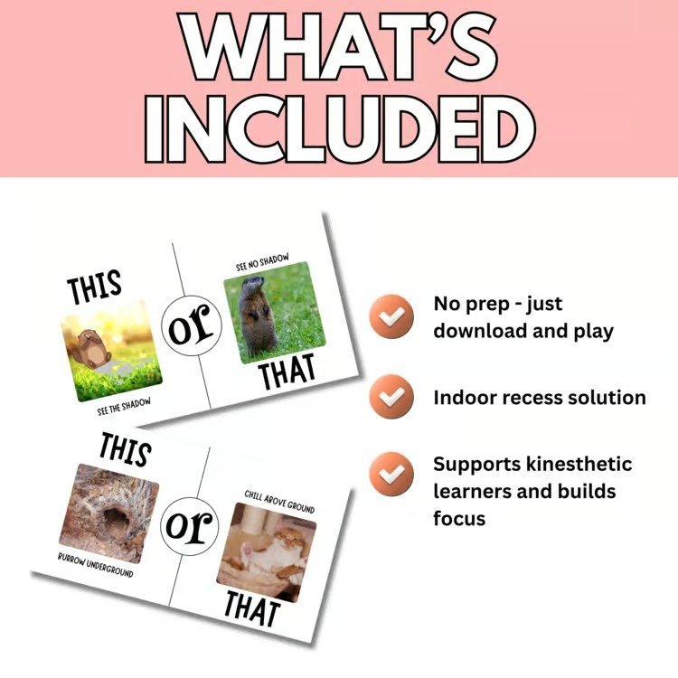 This or That Movement Game: Groundhog Day Edition is a fun, interactive way to combine physical activity with learning. Perfect for a quick brain break, a lively discussion activity, or a festive addition to morning meetings, centers, or writing prompts, this game brings energy and engagement to your classroom.