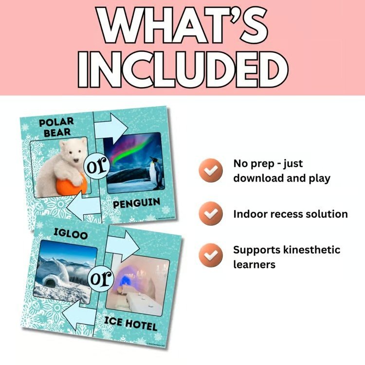 This no prep brain break activity gets students up and moving while practicing critical thinking skills! Perfect for whole group, small group, substitutes, or indoor recess. I also love to follow up the game and use them as writing prompts for opinion writing.